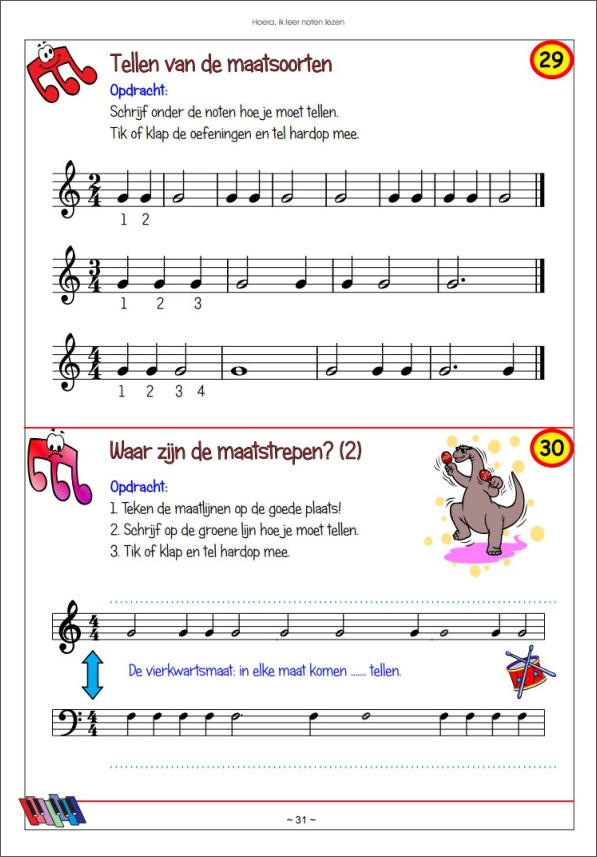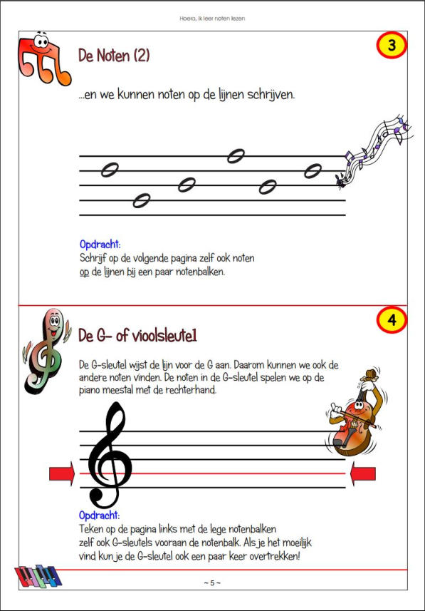 Een kleurig en speels boek met oefeningen om noten te leren lezen, maatoefeningen te maken, notenwaarden te leren, etc. Het is in de afgelopen jaren tijdens de lessen gegroeid vanuit de behoefte om op een speelse manier meer aandacht te besteden aan noten lezen, maat en tellen. Zeer geschikt voor kinderen vanaf een jaar of zes, zeven. De meeste kinderen werken er met plezier in en vragen daarna om meer...In de onderstaande afbeeldingengalerie vind je een selectie van de inhoud.
